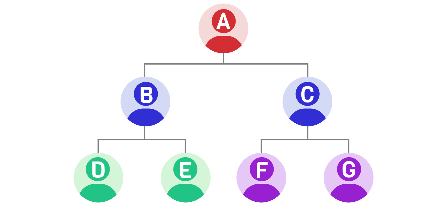 In the example, distributor A is at the top, with distributors B and C as their direct frontline distributors. Distributor B has frontline distributors D and E, while distributor C has frontline distributors F and G. This binary structure continues to grow as more distributors join and sponsor new members.